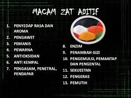 Menurut Wikipedia, aditif makanan adalah bahan tambahan makanan yang dengan sengaja ditambahkan dalam jumlah kecil.